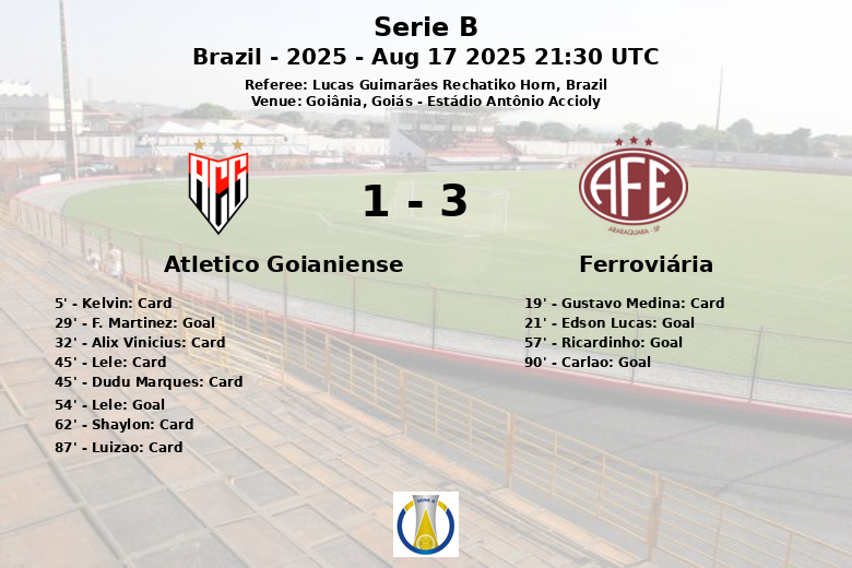 Atlético Goianiense dominated ball possession with 56% compared to Ferroviária’s 44%. Both teams took 14 shots, although Atlético Goianiense had a slight advantage in shots on target (5 against 4). Referee Lucas Guimarães Rechatiko Horn cautioned several players, showing 6 yellow cards to Atlético Goianiense and only 1 to Ferroviária.