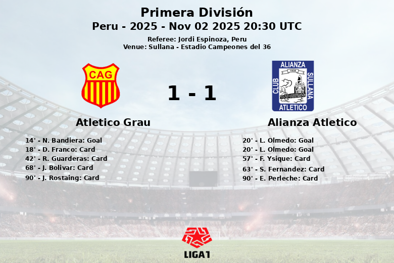 Referee Jordi Espinoza showed a total of seven yellow cards, four for Atlético Grau (D. Franco, R. Guarderas, J. Bolivar, and J. Rostaing) and three for Alianza Atlético (F. Ysique, S. Fernandez, and E. Perleche), reflecting the intensity of the match. In added time, both teams received yellow cards. The match ended with a feeling that both teams could have done more to take the victory, but the draw was a fair result given what was seen on the field.