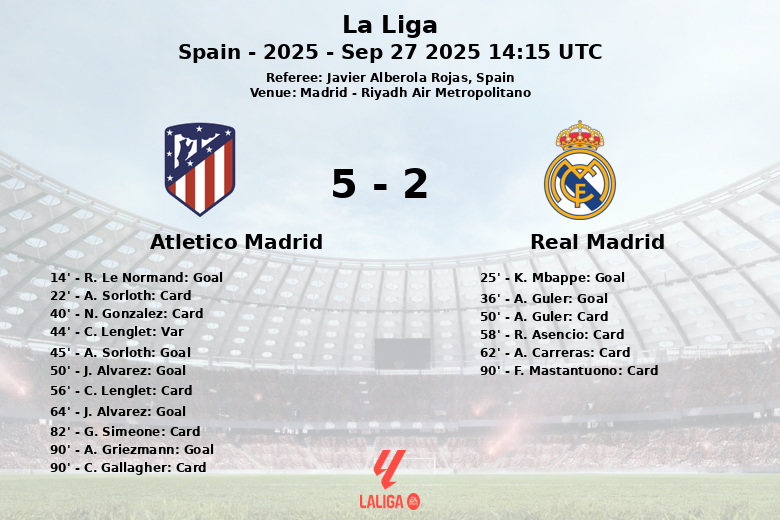 Madrid, Spain – Atlético Madrid triumphed over Real Madrid in a captivating derby match held at the Riyadh Air Metropolitano, with a final score of 5-2. The match, part of La Liga’s seventh matchday, was filled with intensity and pivotal moments.