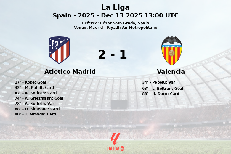 Koke opened the scoring for Atlético in the 17th minute with a goal that ignited the stands. However, Valencia did not back down and relentlessly sought the equalizer. The match was marked by tension, with several yellow cards shown to Atlético players (Pubill, Sorloth, Simeone and Almada) and one for Valencia (Duro). A goal by Pepelu for Valencia was disallowed by VAR due to an offside position, generating controversy.