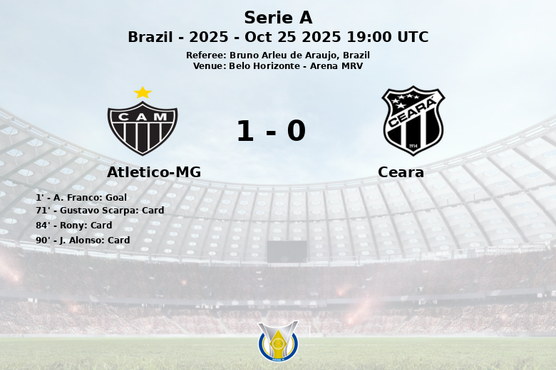 Belo Horizonte, October 25, 2025 – Atlético Mineiro secured a narrow victory in their match against Ceará, played at Arena MRV. The only goal of the match came early, just in the first minute, thanks to a strike by A. Franco assisted by Dudu.