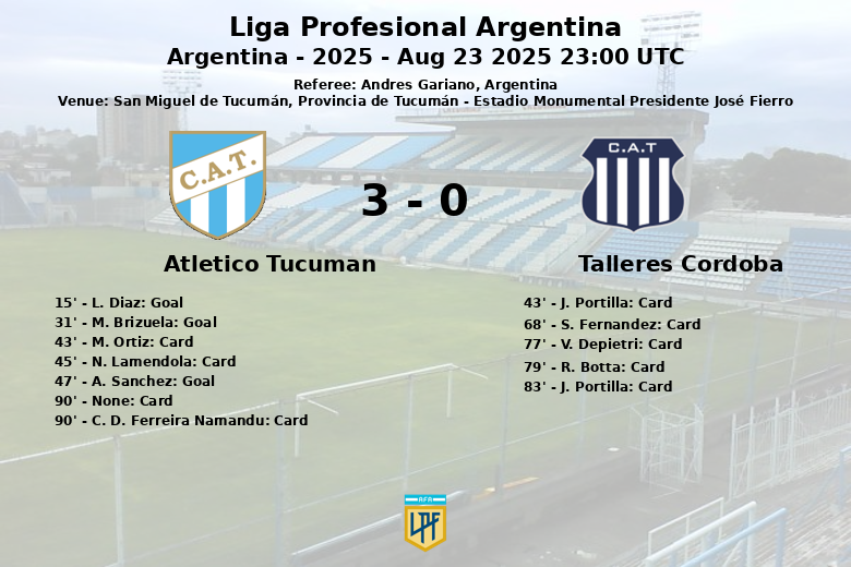 The first goal came at the 15th minute, scored by L. Diaz, who received a precise assist from N. Lamendola to open the scoring. Atlético Tucumán extended their lead at the 31st minute thanks to M. Brizuela, assisted by D. Martinez. The first half concluded with a series of cautions for both teams, including yellow cards for J. Portilla and M. Ortiz at the 43rd minute, and for N. Lamendola at the 45th minute.