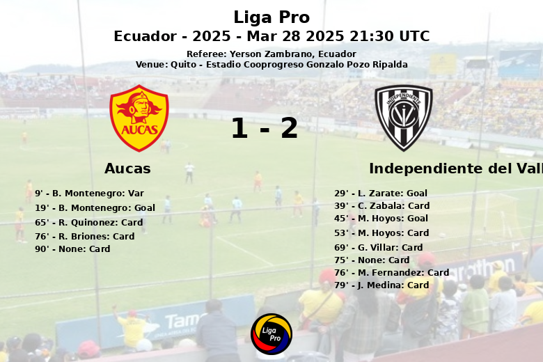 Quito, March 28, 2025.- Aucas defeated Independiente del Valle 1-2 in a match played at the Estadio Cooprogreso Gonzalo Pozo Ripalda. The game, officiated by Yerson Zambrano, was marked by controversy and a lack of clear scoring chances.