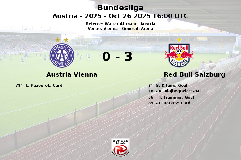Salzburg opened the scoring early, in the 8th minute, with a goal from S. Kitano following an unassisted play. The lead was extended in the 16th minute thanks to K. Alajbegovic, assisted by E. Baidoo. In the second half, T. Trummer sealed the victory with a goal in the 56th minute, again assisted by S. Kitano.