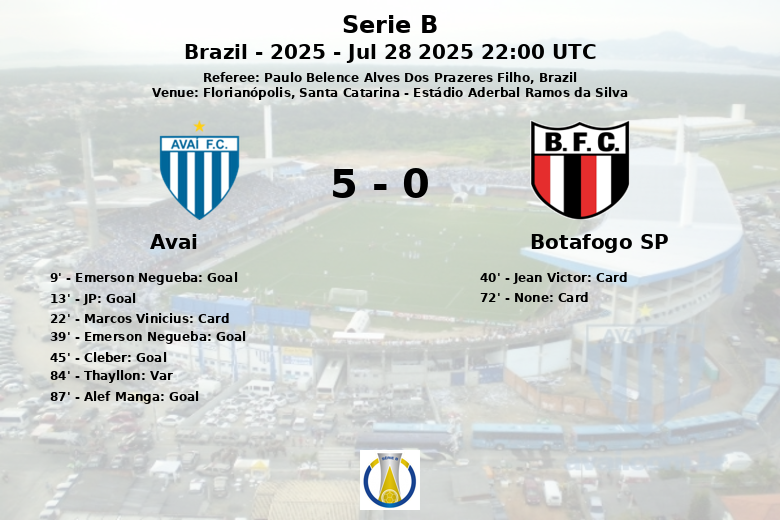 Emerson Negueba opened the scoring early, in the 9th minute, with a precise finish after an assist from JP. JP, in turn, became the protagonist in the 13th minute, extending the lead with a goal of his own, assisted by Ze Ricardo. The first half continued with Avai’s overwhelming dominance, and Emerson Negueba reappeared in the 39th minute, this time with an assist from Cleber, to score his second goal of the night. Just before halftime, Cleber scored from a penalty, further consolidating the home team’s lead.