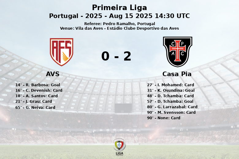 Vila das Aves witnessed a close encounter between AVS and Casa Pia, ending with a victory for the visiting team. AVS dominated possession with 51%, but failed to convert it into goals. The match started with a missed penalty by R. Barbosa of AVS in the 14th minute, although he redeemed himself by scoring shortly after. However, Casa Pia reacted and K. Osundina equalized the score in the 31st minute, assisted by J. Livolant. The first half was marked by intense play, with several yellow cards for both teams: C. Devenish, A. Santos, and J. Grau for AVS, and I. Mohamed for Casa Pia.