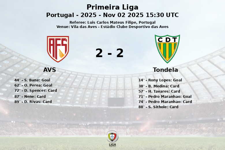 Tondela opened the scoring in the 14th minute thanks to a goal by Rony Lopes, giving the visiting team the lead. However, AVS reacted before halftime with a goal by S. Bane in the 44th minute, leveling the score.