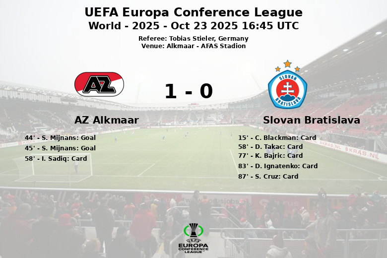 In the second half, AZ continued to press but failed to score more goals. Slovan Bratislava, on the other hand, barely generated any danger in attack, with only two shots in the entire match, one of which was on target. The game was interrupted by several cards, including four yellow cards for Slovan and one for AZ. The match culminated with the expulsion of S. Cruz from Slovan Bratislava in the 87th minute, leaving the Slovak team with ten players. AZ Alkmaar takes the victory at home after a match with clear superiority.