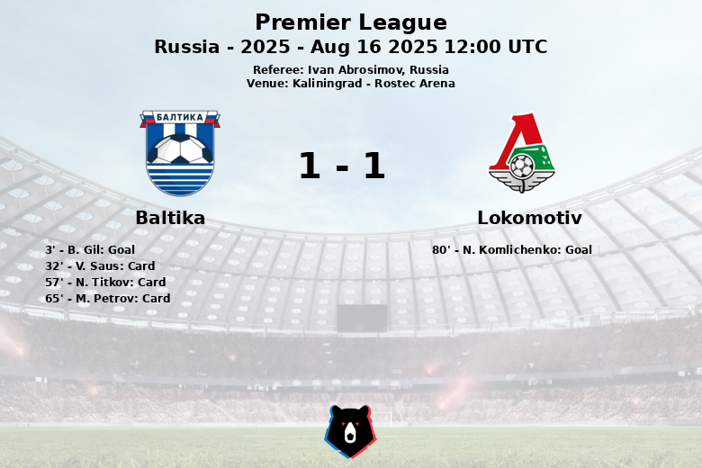 Kaliningrad, Russia – Baltika and Lokomotiv Moscow played out a 1-1 draw in a tightly contested match at the Rostec Arena, as part of the fifth round of the Russian Premier League. The match, officiated by Ivan Abrosimov, saw Baltika take an early lead (3rd minute) through a goal by B. Gil, assisted by I. Petrov.