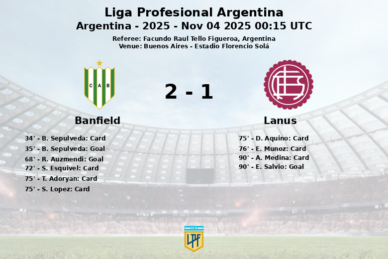 Banfield, with 15 total shots (4 on target) and 7 corners, made better use of their opportunities, while Lanús, with 10 shots (3 on target) and 2 corners, could not translate their dominance into goals. Referee Facundo Raul Tello Figueroa had a demanding task in this match of the 14th matchday of the second phase of the Liga Profesional Argentina.
