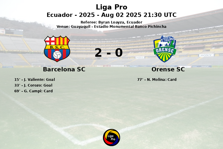 Despite a game with few goal-scoring opportunities from Orense (only one shot on target throughout the entire match), Barcelona SC maintained control, although without generating an avalanche of offensive chances. The match was characterized by a tactical and controlled game by the home team, who managed to maintain the advantage until the end. The match, valid for the 23rd round of the Liga Pro 2025, saw referee Byran Loayza cautioning one player from each team.