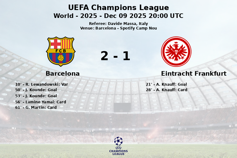 Barcelona, December 9, 2025 – Barcelona secured a valuable home victory against Eintracht Frankfurt in a UEFA Champions League group stage match held at the Spotify Camp Nou. The match, officiated by Italian referee Davide Massa, was marked by intensity and goal-scoring opportunities.