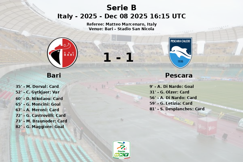 Bari dominated possession (67%) and persistently sought the equalizer, but encountered an organized Pescara defense. M. Dorval of Bari received a yellow card in the 35th minute. The second half was filled with incidents. A goal by C. Gytkjaer for Bari was disallowed for offside after VAR review in the 52nd minute. Shortly after, G. Moncini missed a penalty in the 65th minute, although he would later assist G. Maggiore to score the tying goal in the 82nd minute, pushing his team to continue the search to level the score.