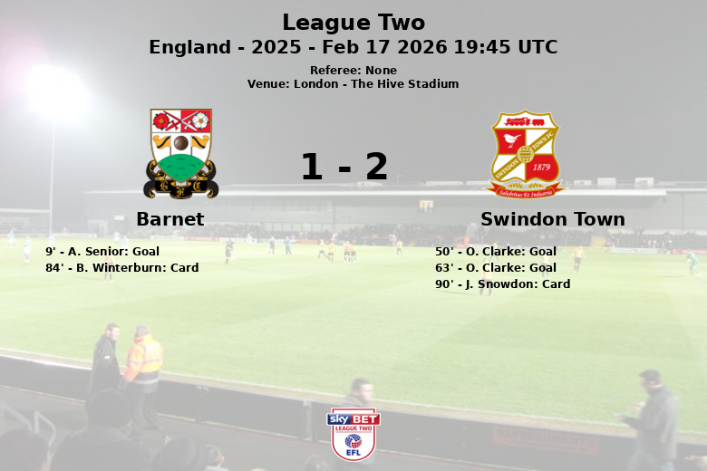 Barnet started aggressively, opening the score early in the 9th minute with a goal by A. Senior, assisted by M. Shelton. However, Swindon Town responded with renewed energy in the second half. O. Clarke equalized in the 50th minute, and then scored again in the 63rd minute, this time assisted by F. Holman, giving his team the definitive lead.