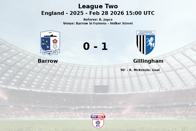 A dramatic League Two encounter unfolded in Barrow in Furness, with Gillingham snatching a late victory against Barrow thanks to a 90th-minute goal. The match, played at Holker Street, saw Barrow dominate possession with 59%, but they failed to convert that dominance into goals. The home side attempted 5 shots, with none hitting the target and 2 going wide. They earned 3 corners and committed 7 fouls, without receiving any cards.