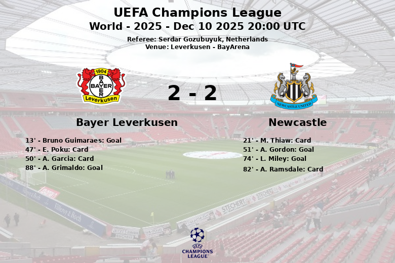 Bayer Leverkusen took the lead thanks to an own goal by Bruno Guimaraes in the 13th minute, following a play initiated by R. Andrich. However, Newcastle responded in the second half. A. Gordon equalized from the penalty spot in the 51st minute. The visitors completed the comeback in the 74th minute with a goal from L. Miley, assisted by A. Gordon.