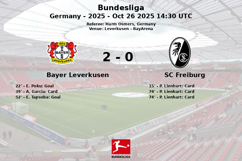 In the second half, Leverkusen extended their lead in the 52nd minute with a goal by E. Tapsoba, after an assist from A. Grimaldo. The situation became even more complicated for Freiburg when P. Lienhart received a second yellow card in the 74th minute, resulting in his sending off.