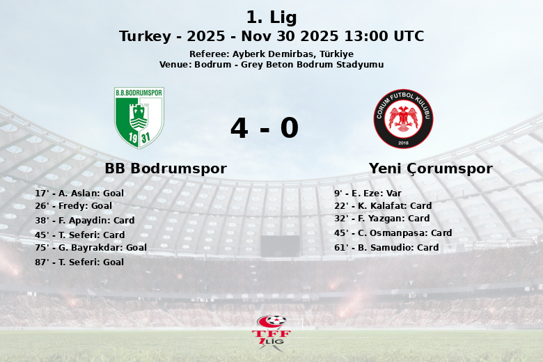 The score was opened in the 17th minute with a goal by A. Aslan, assisted by Z. Dimitrov, giving Bodrumspor the initial lead. Fredy extended the advantage in the 26th minute. Although Yeni Çorumspor fought to stay in the game, a goal disallowed for offside in the 9th minute and the aforementioned expulsion complicated their aspirations.