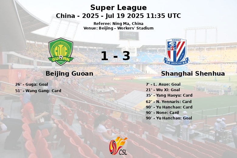 Shanghai Shenhua surprised early with a goal by L. Asue in the 7th minute, assisted by Gao Tianyi. The lead was extended in the 21st minute with a goal by Wu Xi. However, Beijing Guoan reacted, with Guga scoring in the 26th minute, rekindling local hopes.
