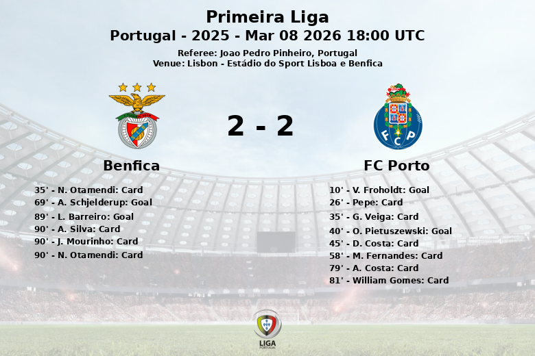 Benfica responded in the second half. A. Schjelderup reduced the deficit in the 69th minute, giving hope to the home fans. The equalizer came in the 89th minute, with a goal by L. Barreiro, igniting euphoria in the stadium.