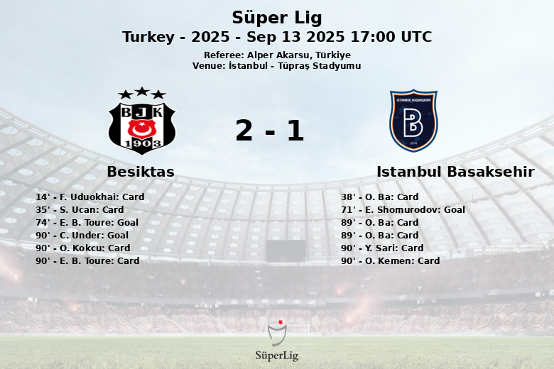 The climax came in added time. C. Under scored the winning goal for Besiktas in the 90th minute, with an assist from D. E. Tiknaz. The end of the match was chaotic, with a red card for O. Ba of Istanbul Basaksehir and another for O. Kokcu of Besiktas. In addition, several players received yellow cards in the final moments.