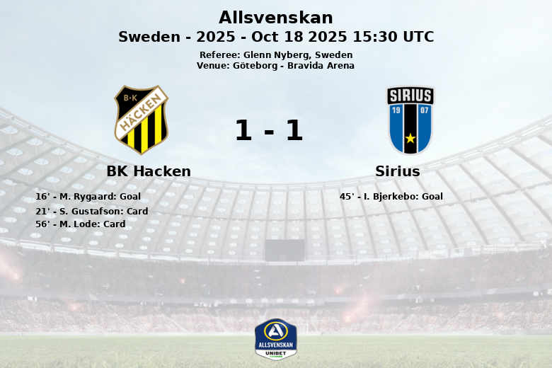The second half maintained the same tone, with both teams seeking the winning goal. Despite Hacken’s superiority in possession and a greater number of shots on target, Sirius defended solidly and managed to maintain the draw until the end. The match was also marked by two yellow cards shown to BK Hacken players, S. Gustafson in the 21st minute and M. Lode in the 56th minute. Sirius, for its part, managed to maintain impeccable discipline and received no warnings. The locals had 7 corner kicks, while Sirius had 3. The match ended with the following result: