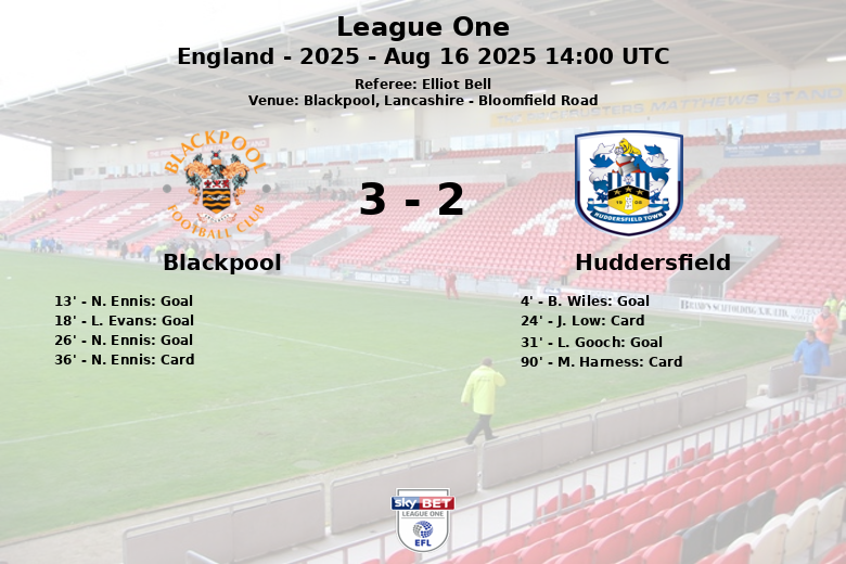 Huddersfield started strong, with a goal by B. Wiles in the 4th minute, assisted by R. Roosken. However, Blackpool responded quickly with a brace from N. Ennis (minutes 13 and 26, with an assist from G. Honeyman on the second) and a goal from L. Evans in the 18th minute, assisted by A. Fletcher, taking the lead. Huddersfield closed the gap again with a goal from L. Gooch in the 31st minute, assisted by A. May.