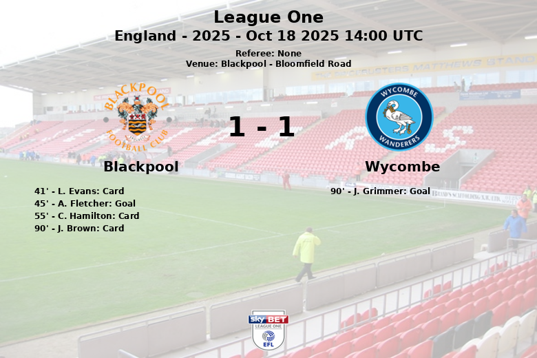 Just when it seemed Blackpool would secure the victory, J. Grimmer of Wycombe scored in the 90th minute, assisted by C. Taylor, leveling the score and sealing the draw. The match concluded with a yellow card for J. Brown of Blackpool in added time. In total, Blackpool had 6 shots, 1 of which was on target, while Wycombe had 13 shots, 5 of which were on target.