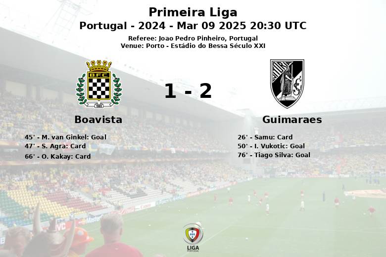 Boavista took the lead in the 45th minute with a penalty goal scored by M. van Ginkel. However, Vitória de Guimarães responded quickly. An own goal by I. Vukotic at the start of the second half leveled the score. The match was decided in the 76th minute, with a penalty scored by Tiago Silva sealing the victory for the visiting team.