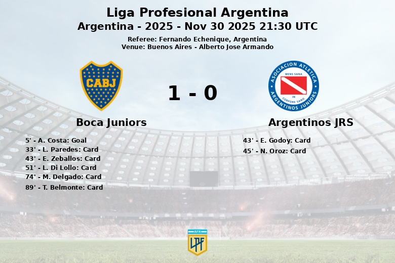 Possession clearly favored Argentinos Jrs, who also had more corner kick opportunities with 8 in total against Boca’s 3, but they weren’t enough to achieve equality. The match was also interrupted by numerous fouls and cautions. Boca Juniors accumulated 12 fouls and 5 yellow cards for L. Paredes, E. Zeballos, L. Di Lollo, M. Delgado and T. Belmonte, while Argentinos Juniors committed 8 fouls and received 2 yellow cards for E. Godoy and N. Oroz.