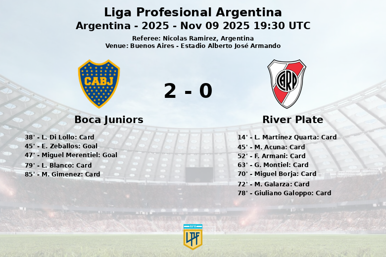 Buenos Aires, Argentina – Boca Juniors defeated River Plate at the Estadio Alberto José Armando in a vibrant and controversial Superclásico. The match, corresponding to matchday 15 of the Liga Profesional Argentina, 2025 Season, culminated in a score of 2 to 0 in favor of the home team.