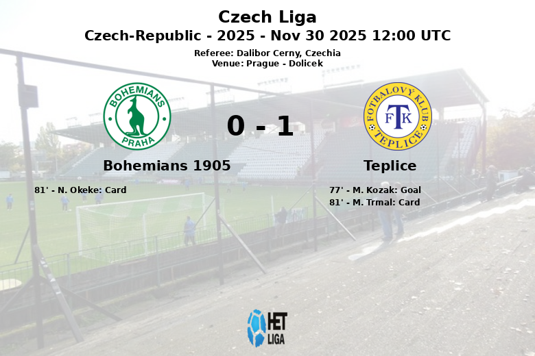 Prague – In a match played at Dolicek stadium, Teplice secured a valuable away victory against Bohemians 1905. The match, part of the Czech Liga 2025, Round 17, was decided in the 77th minute with a goal by M. Kozak, assisted by R. Jukl.