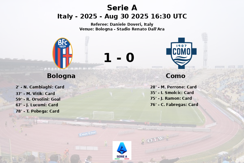Como, dominating possession with 64%, struggled to translate their control of the ball into clear goal-scoring opportunities. Despite generating 12 shots, only one managed to trouble the opposing goalkeeper. The match was interrupted by numerous fouls, 12 committed by Bologna and 18 by Como, resulting in a total of seven yellow cards. Referee Daniele Doveri had a busy afternoon, cautioning four Bologna players and three from Como. The match ended with a score of 1-0 in favor of Bologna.