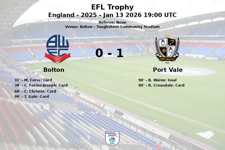 When everything seemed to indicate that Bolton would take the victory, Port Vale delivered a decisive blow in the 90th minute thanks to a goal from B. Waine, leaving the local crowd stunned and sealing a valuable draw.