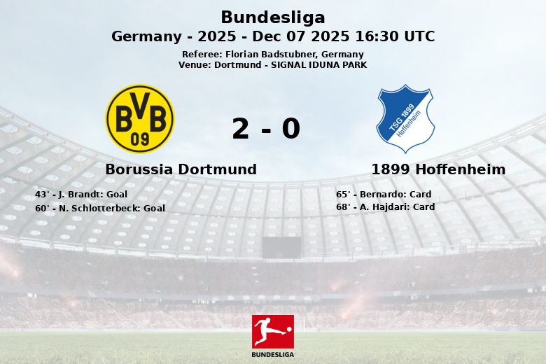Dortmund, Germany – Borussia Dortmund defeated 1899 Hoffenheim at SIGNAL IDUNA PARK in a match corresponding to matchday 13 of the Bundesliga. The home team, despite having less possession of the ball (43% against 57%), demonstrated effectiveness in attack. The first goal came in the 43rd minute, scored by J. Brandt, after an assist from Y. Couto. In the second half, N. Schlotterbeck extended Dortmund’s lead in the 60th minute, assisted by F. Nmecha.
