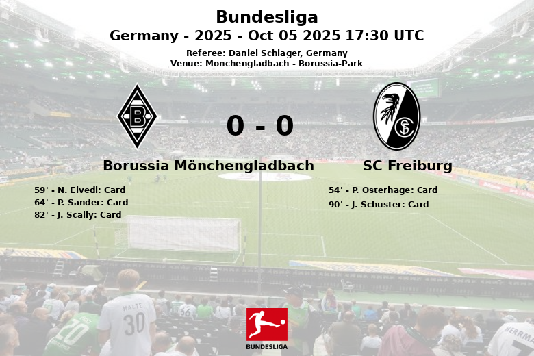 The match was characterized by tactical play and a midfield battle, reflected in the numerous fouls committed by both teams: 15 by Borussia Mönchengladbach and 7 by SC Freiburg. Referee Daniel Schlager was forced to show 3 yellow cards to Borussia Mönchengladbach (N. Elvedi, P. Sander, J. Scally) and 1 to SC Freiburg (J. Schuster). Despite the chances created, neither team could break the deadlock, leaving the score at a disappointing 0-0. The home fans expected more from their team, while SC Freiburg takes a valuable point from their visit to Monchengladbach.