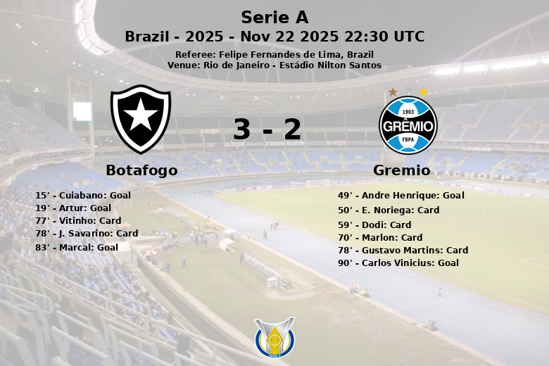 Gremio did not back down and sought a reaction in the second half. Andre Henrique pulled one back in the 49th minute, assisted by C. Pavon, giving hope to the visiting team. However, Marcal, in the 83rd minute, extended Botafogo’s lead again, assisted by David Ricardo, which seemed to seal the match. In a dramatic finale, Carlos Vinicius scored for Gremio in the 90th minute, again assisted by C. Pavon, sealing the final draw.