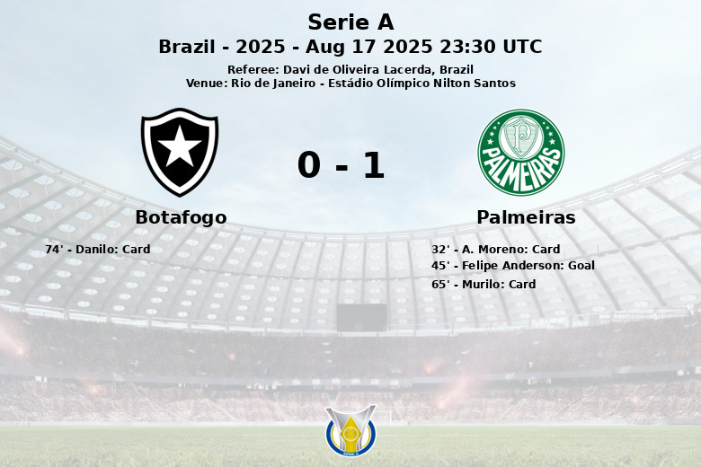 The first half progressed at an intense pace, although without too many clear chances until, in the 45th minute, Felipe Anderson, assisted by Vitor Roque, opened the scoring for Palmeiras. In the second half, Botafogo tried to react, but the Palmeiras defense remained solid. Referee Davi de Oliveira Lacerda booked A. Moreno and Murilo for Palmeiras, and Danilo for Botafogo.