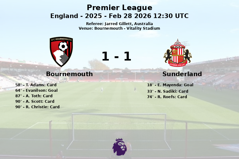 Sunderland took the lead in the 18th minute thanks to a goal by E. Mayenda, after a play with no assist. However, Bournemouth, with constant pressure, managed to equalize in the 64th minute through Evanilson, who took advantage of an assist from M. Tavernier.