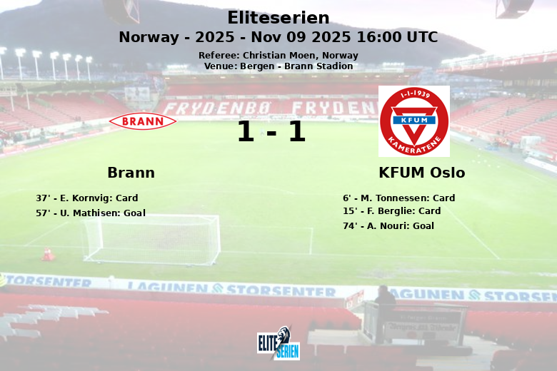 In the second half, Brann took the lead in the 57th minute with a goal by U. Mathisen, assisted by N. Castro. It seemed that the home side was heading towards victory, but KFUM Oslo responded strongly. In the 74th minute, A. Nouri equalized for KFUM Oslo, after an assist from M. Ndiaye.