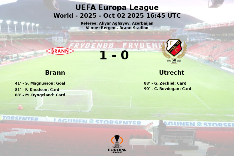Brann emerged victorious with a 1-0 win over Utrecht in a hard-fought UEFA Europa League group stage match at the Brann Stadion in Bergen. The decisive goal came in the 41st minute when S. Magnusson, assisted by F. Myhre, found the back of the net.