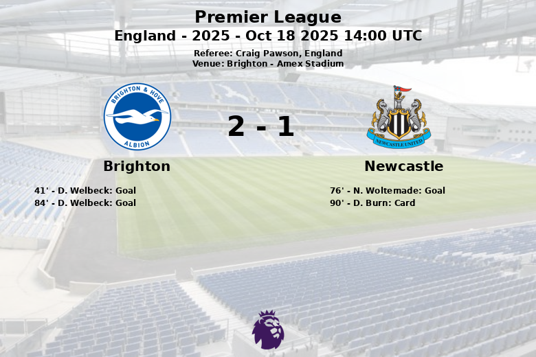 The first goal of the match came in the 41st minute, with Welbeck capitalizing on an assist from G. Rutter to put Brighton ahead. Newcastle responded in the second half, with N. Woltemade scoring in the 76th minute thanks to a pass from L. Miley. However, the joy was short-lived, as Welbeck reappeared in the 84th minute to seal the victory with his second goal.