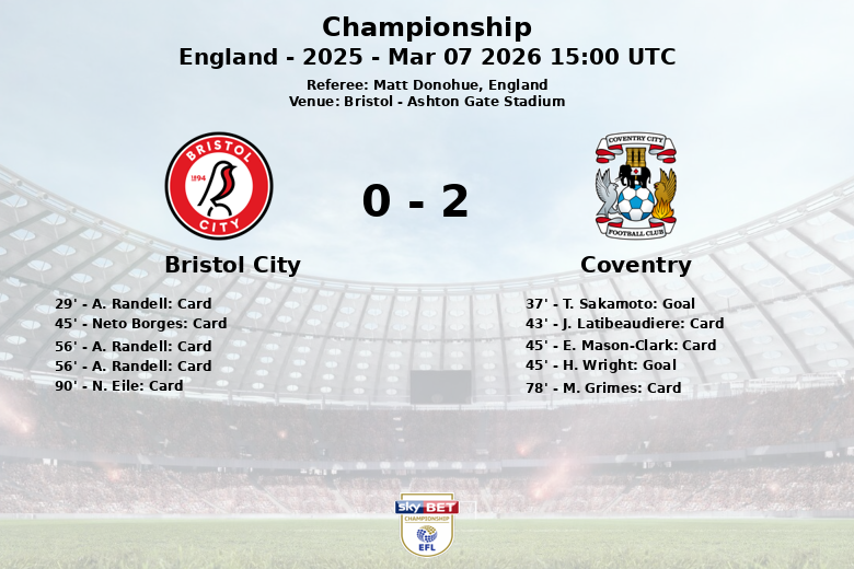 Coventry took the lead with a goal from T. Sakamoto in the 37th minute, assisted by J. Dasilva. Just before halftime, H. Wright extended the visitors’ lead with a goal in the 45th minute. However, the game became even more contested with two expulsions, one for each side. J. Latibeaudiere saw a red card for Coventry in the 43rd minute, while A. Randell was sent off for Bristol City in the 56th minute after receiving his second yellow card.