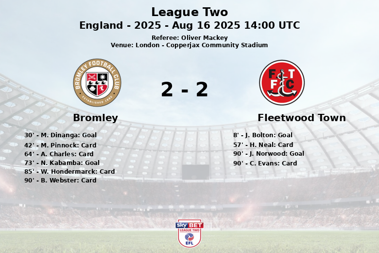 London, England – In an exciting and tense encounter at the Copperjax Community Stadium, Bromley managed to overcome Fleetwood Town with a score of 2-3. The match, part of the third round of the League Two season, was officiated by Oliver Mackey.