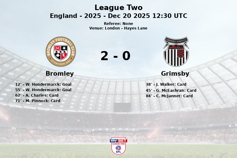 W. Hondermarck emerged as the key player for Bromley, scoring two crucial goals in the 12th and 55th minutes, assisted by D. Elerewe in the first instance and M. Ifill in the second. Despite Grimsby’s efforts to find the net, Bromley’s defense remained resolute, limiting the opposition’s shots on target.
