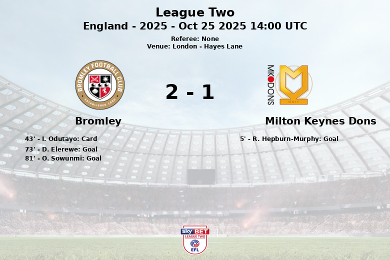 Bromley showed more attacking aggression with 8 shots (3 on target) compared to Milton Keynes Dons’ 5 (2 on target). The home side also surpassed their rival in corners (7 against 2). However, Milton Keynes Dons committed more fouls (10 against 7). I. Odutayo from Bromley was the only player booked in the match. The match concluded with a final score of two to two.