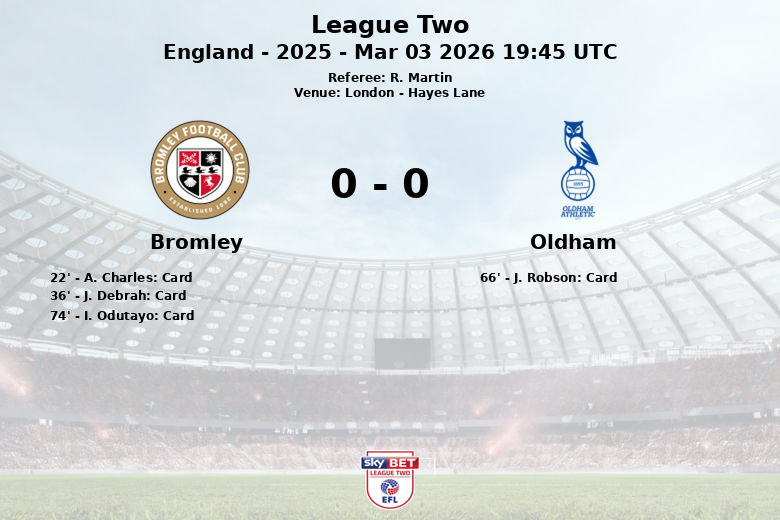 London, England – In a League Two clash held at Hayes Lane, Bromley and Oldham Athletic failed to break the deadlock, ending the match with a 0-0 scoreline. Under the watchful eye of referee R. Martin, the game, corresponding to matchday 25 of the 2025 season, was characterized by a strong midfield battle and few clear goal-scoring opportunities.