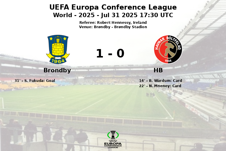 The sole goal of the match came in the 31st minute, courtesy of a strike by S. Fukuda, assisted by C. Bischoff. Despite a barrage of 26 shots, only 3 managed to find their way on target. HB, on the other hand, struggled to maintain possession, generating just 6 shots, with 2 on target. Discipline proved to be an issue for HB, who accumulated 2 yellow cards (B. Wardum and N. Mneney) and committed 12 fouls, while Brøndby maintained a clean record in terms of cards. Brøndby generated a total of 12 corner kicks, compared to HB’s single corner. Irish referee Robert Hennessy oversaw the encounter.