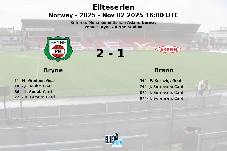 Bryne triumphed at home against Brann in a match held at Bryne Stadion. The encounter, part of matchday 27 of the Eliteserien 2025, was marked by a blazing start from the home team, who managed to open the score at minute 1 with a goal by M. Grodem, assisted by D. Moreira. The lead was quickly extended at minute 18, with J. Haahr scoring, assisted by A. Skovgaard.