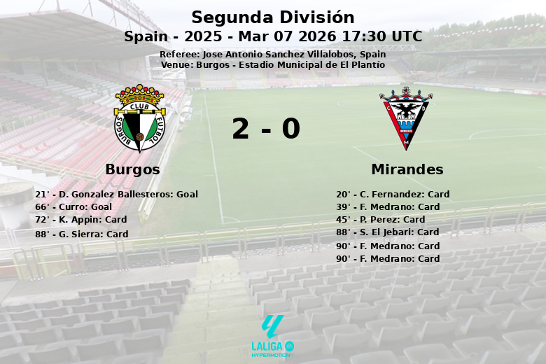 In the second half, Burgos extended their lead in the 66th minute with a goal from Curro, assisted by K. Appin. Mirandés, although trying to react, was hampered by Burgos’ strong defense and the accumulation of yellow cards. The game heated up even more in the final minutes, with several cards for both teams, including a red card for F. Medrano in stoppage time. Burgos finished with 14 shots, 4 of which were on target, while Mirandés had 12 shots with 6 on target. The match, refereed by Jose Antonio Sanchez Villalobos, ended with a total of 7 yellow cards and 1 red card.
